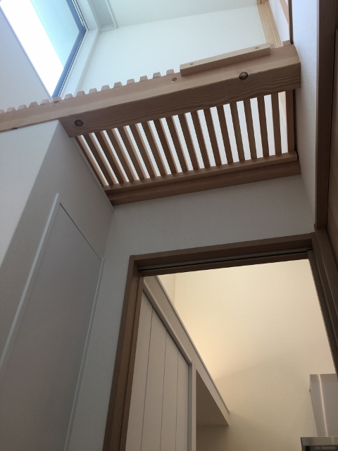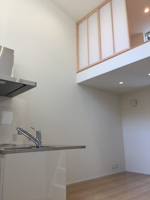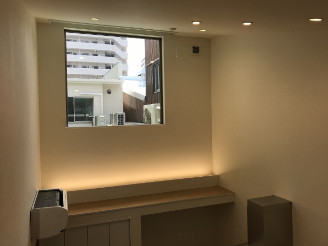 ■キッチン上部のフィックス窓により家の中に十分な照度を確保する。間接照明が柔らかく照らす。
