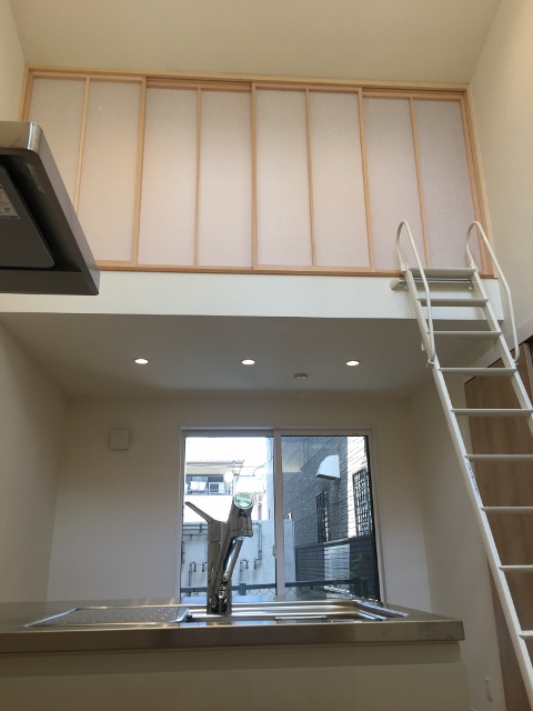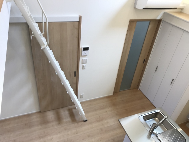 扉は右側が玄関へ、左側が洗面所へとそれぞれつながっている。ロフトへ上がる梯子。