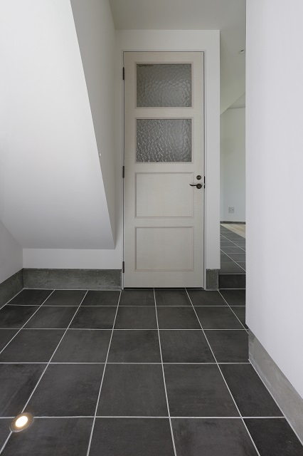 ◆事務所から、玄関 洗面スペース等へと続く廊下は磁器質タイル張り。全てがフラットで、車椅子でスムーズに移動できる。