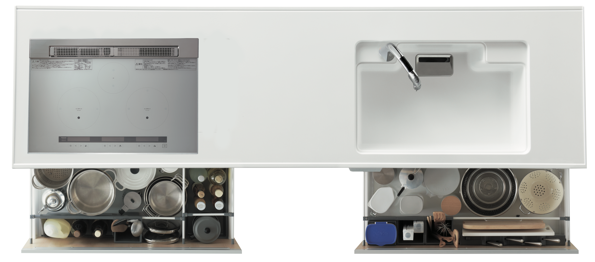 シンクや水栓、IHクッキングヒーター、レンジフード、収納など、キッチンのすべてに使いやすさを考えたシステムキッチン。