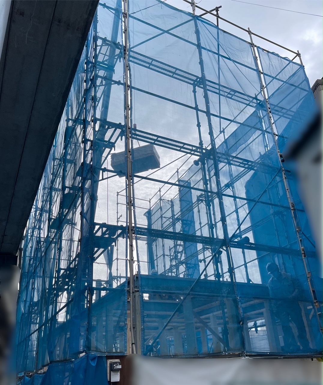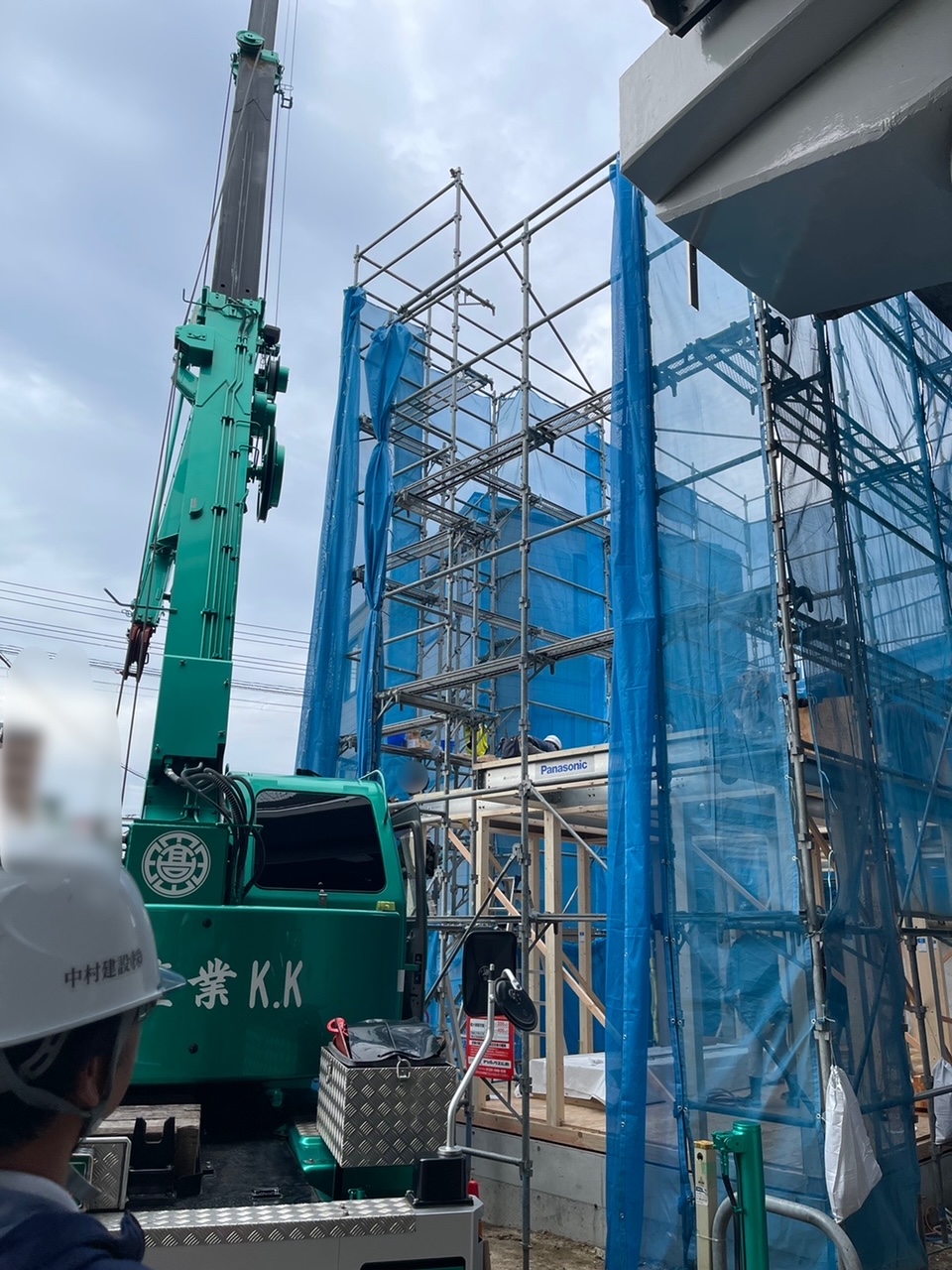 中村建設では初めて「テクノストラクチャーEX」を用いた木造3階建て二世帯住宅の施工中。先日その棟上げが行われました。