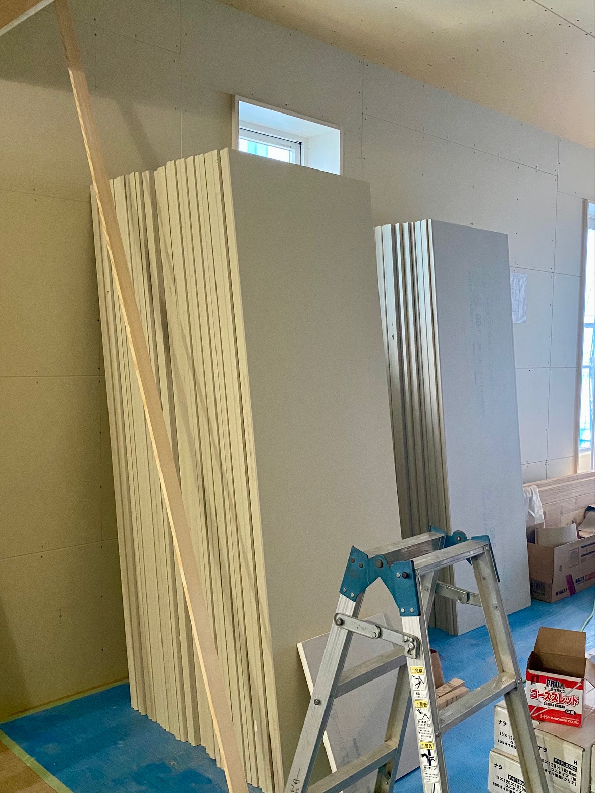 耐火建築物にするために、下地の21㎜のプラスターボードを二重張りにしていきます。