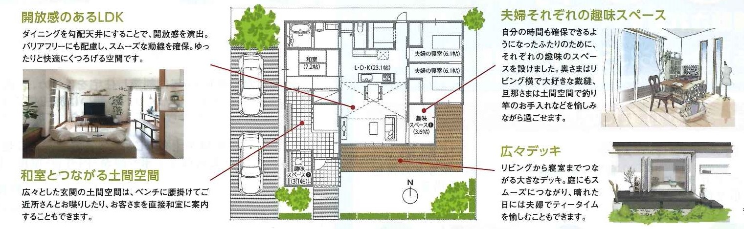 寝室の他には趣味の部屋、例えば奥様は裁縫や手芸。ご主人は釣り。テレワークが浸透してきた現在ではワークスペースとしても良いですね。家族の団らんも一人の時間もバランス良く過ごせる間取りとなっています。